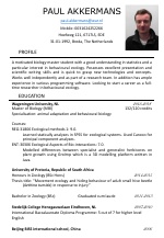 Master in Biologie aan de Universiteit van Wageningen met specialisatie dier adaptatie en gedragskunde. 132 van 120 credits behaald. Heb veldwerk in Zuid-Afrika gedaan aan de Lajuma onderzoekscentrum. Heb hier de kroonparelhoen gevolgd en vluchtgedrag bestudeerd in reactie op apen alarm roepen. Heb vegetatie dichtheid gemeten met fotos en een groot schaakbord met behulp van ImageJ. Heb alle statistiek gedaan in R-studio. Daarnaast heb ik nog gedrag van twee invasieve zoetwaterkreeften bestudeerd en gekeken naar welke lichaamskenmerken invloed hebben op de uitkomst van een interspecifiek gevecht. Tijdens dit werkstuk heb ik zowel R-studio als ImageJ weer gebruikt.